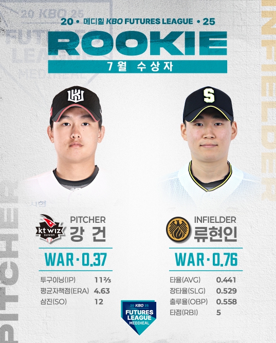 [뉴스노크=김인호 기자] 2025 메디힐 KBO 퓨처스리그의 7월 퓨처스 루키상의 주인공으로 WAR 0.37을 기록한 KT 투수 강건과 WAR 0.76을 기록한 상무 내야수 류현인이 선정됐다.