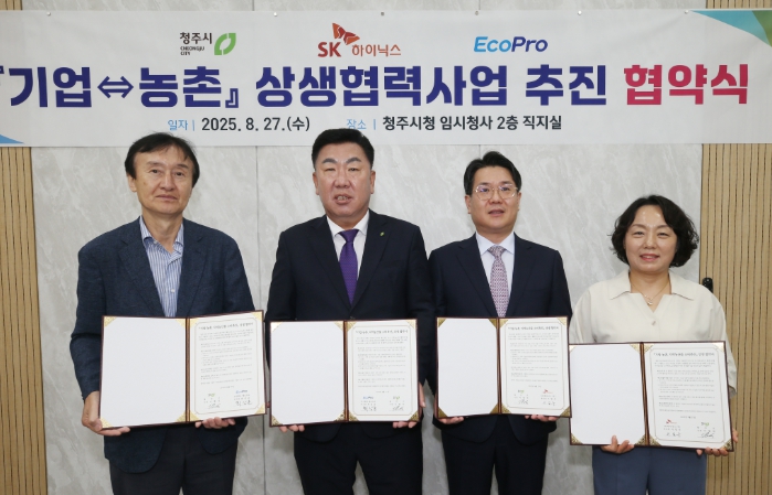 [뉴스노크=김인호 기자] 청주시는 27일 지역 기업인 SK하이닉스㈜, ㈜에코프로와 기업과 농촌 간 상생협력 발전을 위한 업무협약을 체결했다.