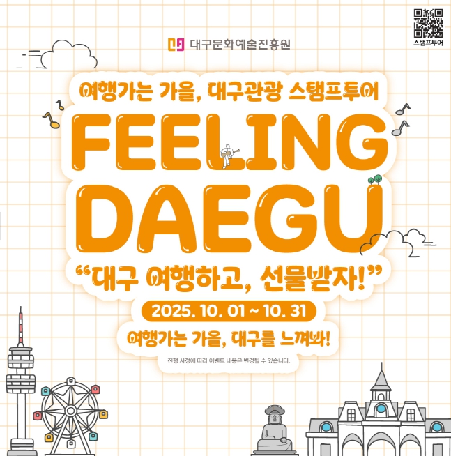 [뉴스노크=김인호 기자] 대구광역시와 대구문예술진흥원관광본부는 문화체육관광부 ‘여행가는 가을’ 캠페인을 연계하여 10월 한 달간 대구를 방문하는 관광객 대상으로 스탬프투어 이벤트를 운영한다.