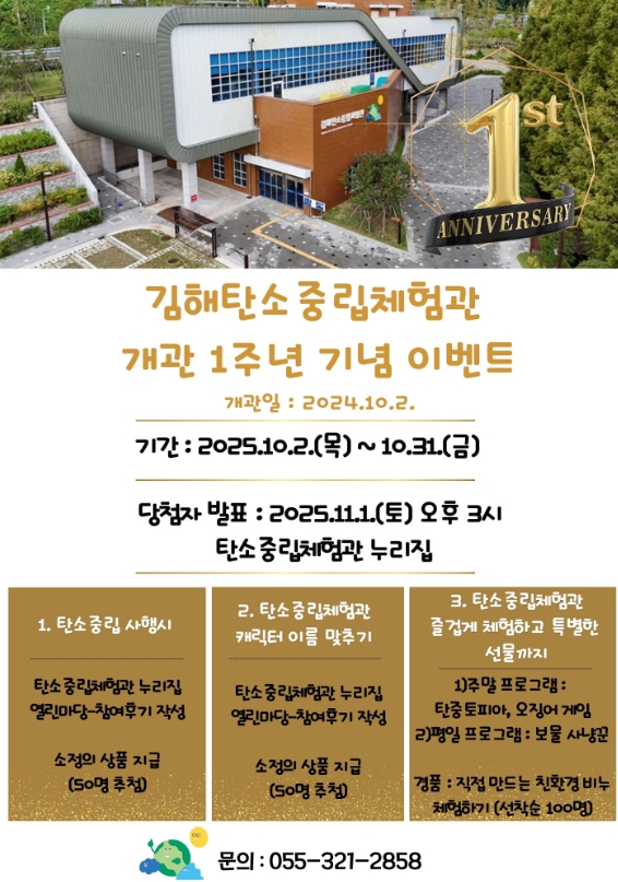 [뉴스노크=김인호 기자] 김해시는 김해탄소중립체험관 개관 1주년을 맞아 2일부터 31일까지 한 달간 특별 기념 이벤트를 운영한다. 이번 이벤트는 온라인과 오프라인 어디든 자유롭게 참여할 수 있다.
