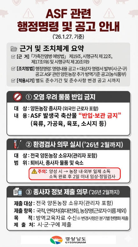 [뉴스노크=김인호 기자] 경상남도는 전남 영광 종돈장에서 아프리카돼지열병(ASF)이 발생하는 등 전국적으로 확산 우려가 커짐에 따라, 도내 모든 양돈농장과 축산시설을 대상으로 고강도 방역 대책을 추진한다고 밝혔다.