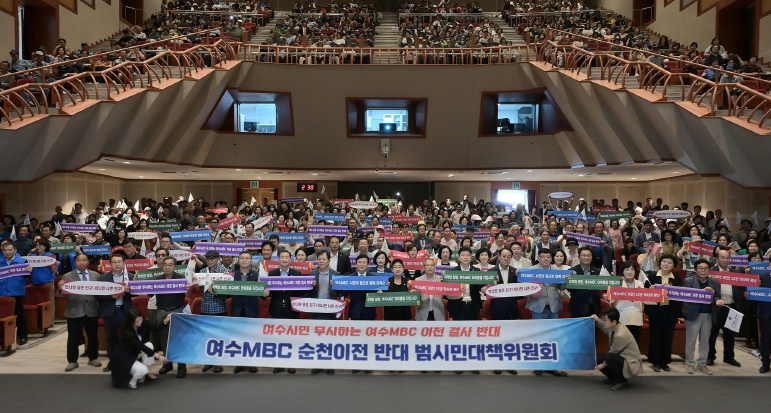 ‘여수MBC 순천이전 반대 범시민대책위원회’가 27일 오후 2시 여수시민회관에서 출범식을 갖고, 선언문을 통해 “시민 의견수렴 없는 일방적 이전추진을 즉각 중단하고 철회하라”며 이같이 밝혔다.