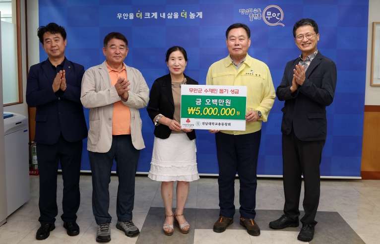 [뉴스노크=김인호 기자] 전남 무안군은 5일 전남대학교 총동창회(회장 류혜경)로부터 집중호우 피해로 어려움을 겪고 있는 군민들을 돕기 위한 성금 500만 원을 기탁받았다.