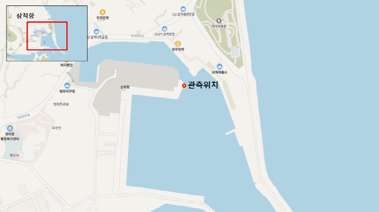 삼척항은 활발한 어업활동과 관광산업이 발달했을 뿐만 아니라 시멘트 수송의 전진기지 역할을 하는 동해안의 주요 무역항으로 선박의 안전과 연안 개발·보전 등을 위해 보다 정확한 조석기준면과 조석예보가 필요해 작년 6월부터 올해 6월까지 삼척항에서 1년간 압력식조위계 등의 해양조사 장비를 이용하여 장기조석관측을 실시했다.