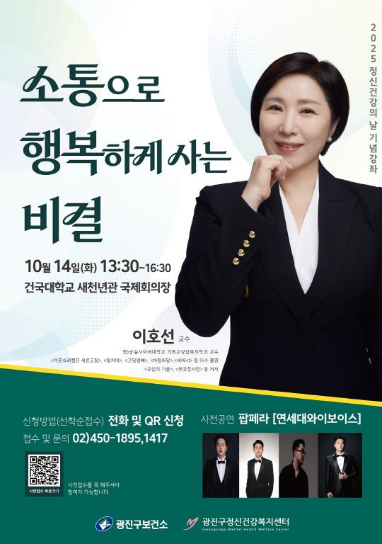 [뉴스노크=김인호 기자] 광진구는 오는 10월 14일 ‘정신건강의 날(매년 10월 10일)’을 맞아 건국대학교 새천년관 국제회의장에서 광진구정신건강복지센터 주관 기념 강좌를 개최한다.