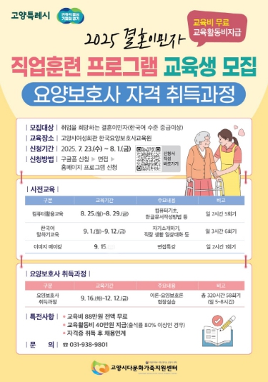 [뉴스노크=김인호 기자] 고양시다문화가족지원센터는 결혼이민자의 직업능력개발과 자립역량을 강화하기 위해 ‘2025년 결혼이민자 직업훈련 프로그램’ 교육생을 모집한다.