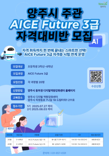 [뉴스노크=김인호 기자] 양주시가 여름방학을 맞아 지역 초등학생들의 디지털 역량 향상을 지원하기 위해 ‘AICE FUTURE 3급 자격증 취득 과정’을 운영한다고 밝혔다.