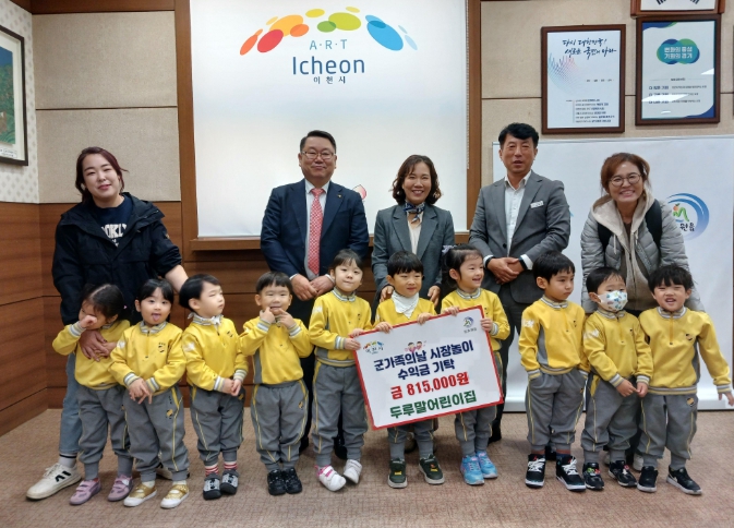 [뉴스노크=김인호 기자] 이천시 장호원읍 두루말어린이집은 11월 11일, 어린이들과 함께 장호원읍행정복지센터에 방문해 군가족의 날 아나바다 시장놀이 행사의 수익금 815,000원을 전달했다.