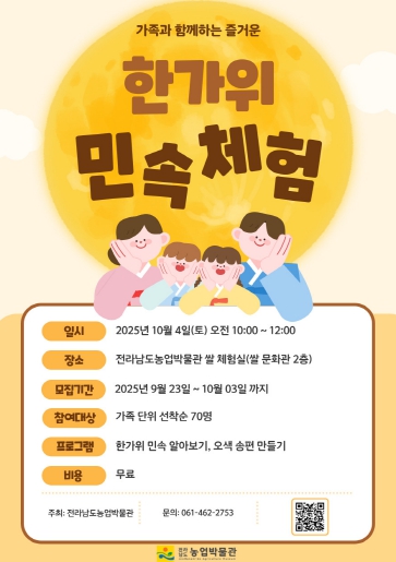 [뉴스노크=김인호 기자] 전라남도 농업박물관은 다가오는 한가위를 맞아 가족 단위 관람객 대상으로 ‘한가위 민속 체험행사’를 10월 4일에 개최한다고 밝혔다.