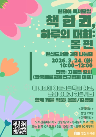 [뉴스노크=김인호 기자] 고양특례시는 오는 3월 24일 오전 10시부터 12시까지 일산도서관 3층 나눔터에서 성인 20명을 대상으로 원데이 독서토론 프로그램 ‘책 한 권, 하루의 대화: 봄 편’을 운영한다고 밝혔다.