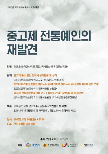 아울러 학술기획총괄을 맡은 성기숙 한국예술종합학교 전통예술원장은 “그동안 제대로 조명되지 못한 내포문화권 국악명인들의 업적을 통해 중고제 전통가무악이 지닌 역사성·학술성·예술성을 되짚은 절호의 기회가 될 것”이라고 덧붙였다,