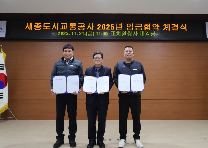 [뉴스노크=김인호 기자] 세종도시교통공사는 11월 21일 조치원본사 3층 대강당에서 교섭대표노동조합(전국지방공기업노동조합연맹 세종도시교통공사 공기업노동조합, 세종도시교통공사 노동조합)과 2025년 임금협약을 체결했다고 밝혔다.
