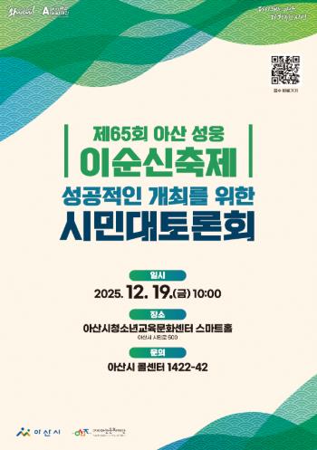 [뉴스노크=김인호 기자] (재)아산문화재단은 ‘'제65회 아산 성웅 이순신축제'의 성공적인 개최를 위한 시민 대토론회’를 오는 19일에 아산시청소년교육문화센터 스마트홀에서 연다.