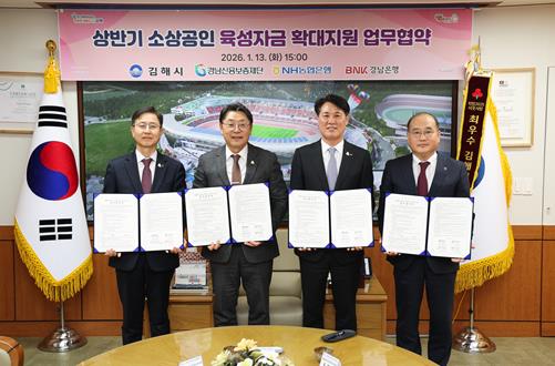 [뉴스노크=김인호 기자] 김해시는 13일 김해시청에서 NH농협은행, BNK경남은행, 경남신용보증재단과 ‘2026년 상반기 소상공인 지원 업무협약(MOU)’을 체결했다.