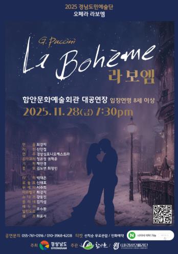 [뉴스노크=김인호 기자] 함안군은 푸치니의 대표작 오페라 〈라 보엠〉을 오는 2025년 11월 28일 오후 7시 30분, 함안문화예술회관 대공연장에서 전석 무료로 선보인다고 밝혔다.