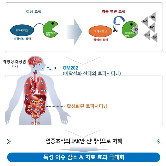‘OM202’는 NSDC(Nitric oxide Scavenger Drug Conjugate) 플랫폼 기반 후보물질로 대표적인 JAK* 억제제인 토파시티닙에 일산화질소(Nitric oxide) 센서를 결합한 신개념 저분자 치료제다.