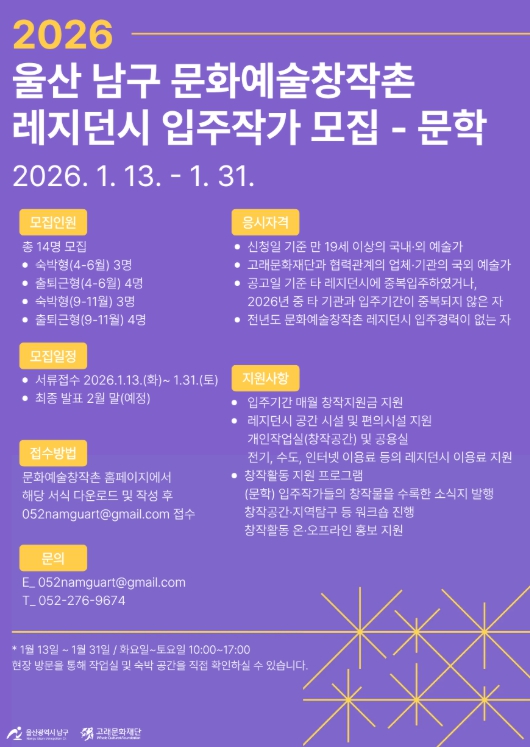 [뉴스노크=김인호 기자] 고래문화재단이 운영하는 울산 남구 문화예술창작촌이 2026년도 레지던시 사업에 참여할 입주작가를 1월 13일부터 1월 31일까지 공개 모집한다.