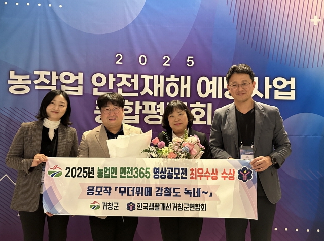 [뉴스노크=김인호 기자] 거창군은 지난 20일 농촌진흥청이 주최한 ‘2025년 농작업 안전재해 예방사업’ 종합 평가회에서 안전 365 캠페인 영상공모전에 한국생활개선거창군연합회(회장 윤진미)와 관의 협력으로 만든 영상이 최우수상을 수상했다고 밝혔다.
