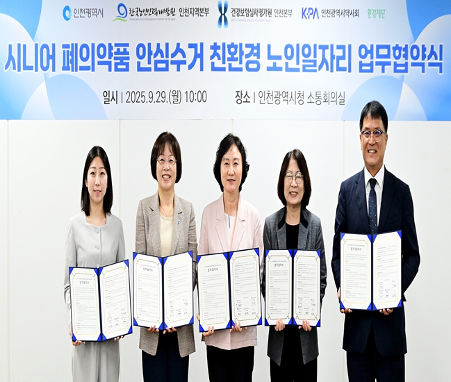 [뉴스노크=김인호 기자] 인천광역시는 9월 29일 시청 청사에서 건강보험심사평가원 인천본부, 인천시약사회, 환경재단, 한국노인인력개발원 인천본부와 함께‘폐의약품 안심분리수거 노인일자리 확대 업무협약’을 체결했다고 밝혔다.