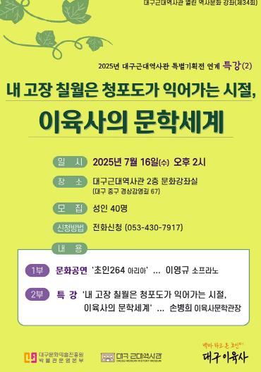 이번이 세 번째 전시 연계 행사로, 7월 16일 2시 대구근대역사관 문화강좌실에서 이육사의 시 ‘청포도’ 속 구절로 행사 제목을 정해, 7월에 맞춰 민족시인·저항 시인으로서의 이육사를 만나는 시간을 마련했다.