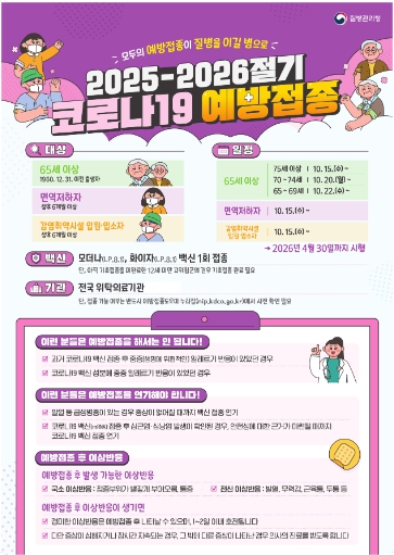 이번 접종은 ▲65세 이상 어르신 ▲면역저하자 ▲감염취약시설 입원(입소)자를 우선 대상으로 한다. 접종에는 질병관리청이 공급하는 최신 개량 백신(화이자‧모더나 백신)이 사용된다.