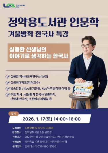 [뉴스노크=김인호 기자] 남양주시는 오는 17일 오후 2시 정약용도서관 2층 공연장에서 겨울방학 인문학 특강 ‘이야기로 생각하는 한국사’를 개최한다.