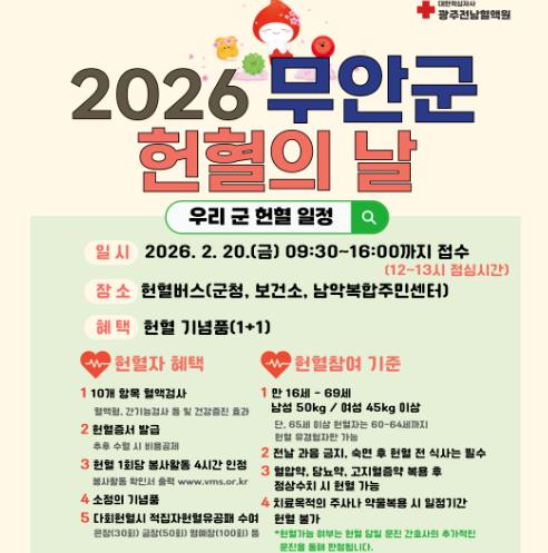 [뉴스노크=김인호 기자] 무안군은 오는 2월 20일 대한적십자사 광주전남혈액원과 함께 헌혈 행사를 개최할 예정이라 밝혔다.