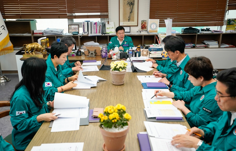 | ▲ 이필형 동대문구청장(사진 가운데)이 재난안전대책본부 회의를 주재하고 있다. |