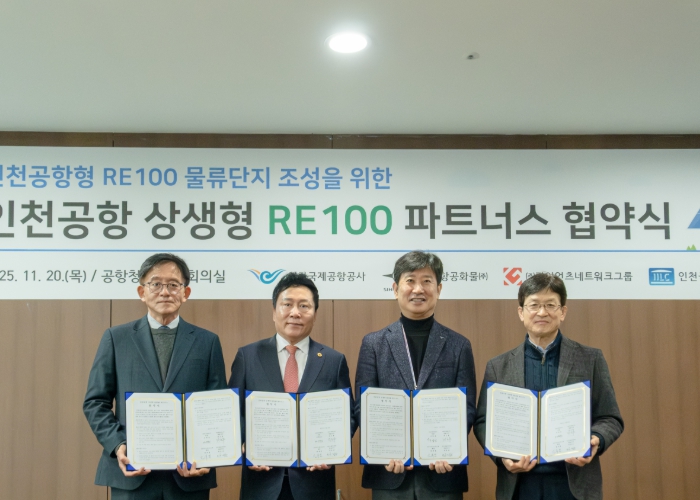[뉴스노크=김인호 기자] 인천국제공항공사는 20일 오전 공항청사 회의실에서 물류단지 입주기업 3개社와 함께 ‘상생형 RE100 파트너스 업무협약(MOU)’을 체결했다고 밝혔다.