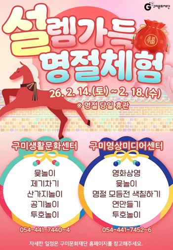 [뉴스노크=김인호 기자] (재)구미문화재단은 다가오는 설 연휴(2. 14. ~ 18.)를 맞아 구미생활문화센터와 구미영상미디어센터에서 시민과 귀성객을 위한 다채로운 문화 향유 프로그램을 운영한다고 밝혔다.