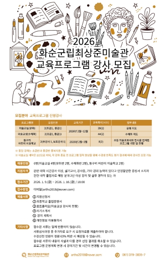 [뉴스노크=김인호 기자] 화순군은 화순군립최상준미술관(화순읍 동구리에 위치)에서 2026년 미술 교육 프로그램을 함께 운영할 전문 강사를 1월 9일부터 1월 16일까지 모집한다고 밝혔다.