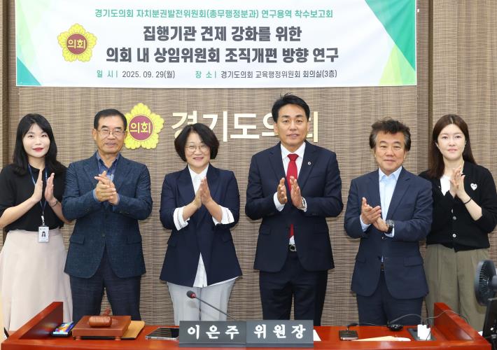 [뉴스노크=김인호 기자] 경기도의회 자치분권발전위원회 총무행정분과는 9월 29일 도의회 교육행정위원회 회의실에서 '집행기관 견제 강화를 위한 의회 내 상임위원회 조직개편 방향 연구' 착수보고회를 개최했다. 이번 연구는 향후 의원 정수 확대에 따라 예상되는 의정 환경 변화에 대응하고, 특히 교육분야 상임위 증설의 필요성을 검토하기 위해 추진됐다.