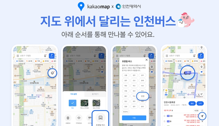 [뉴스노크=김인호 기자] 인천광역시는 오는 9월 30일부터 카카오맵을 통해 실시간(초정밀) 버스 위치 서비스를 제공한다고 밝혔다.