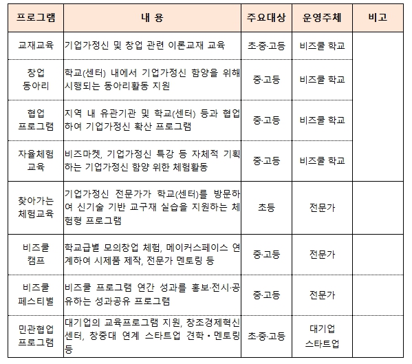 중기부는 2002년부터 400여개 초‧중‧고교를 대상으로 비즈쿨 프로그램을 운영하고 있으며, 청소년들을 대상으로 기업가정신 함양 및 창업 교육을 실시하고, 꿈·도전정신을 갖춘 융합형 창의인재를 양성해왔다.
