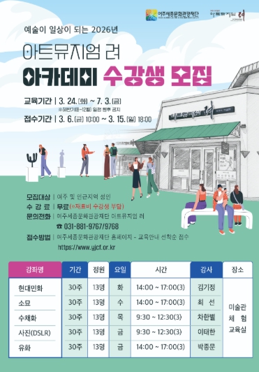 [뉴스노크=김인호 기자] 여주세종문화관광재단 아트뮤지엄 려에서 2026년 3월 6일 ~ 3월 15일 동안 아트뮤지엄 려 아카데미 강좌 수강생을 모집한다고 밝혔다.