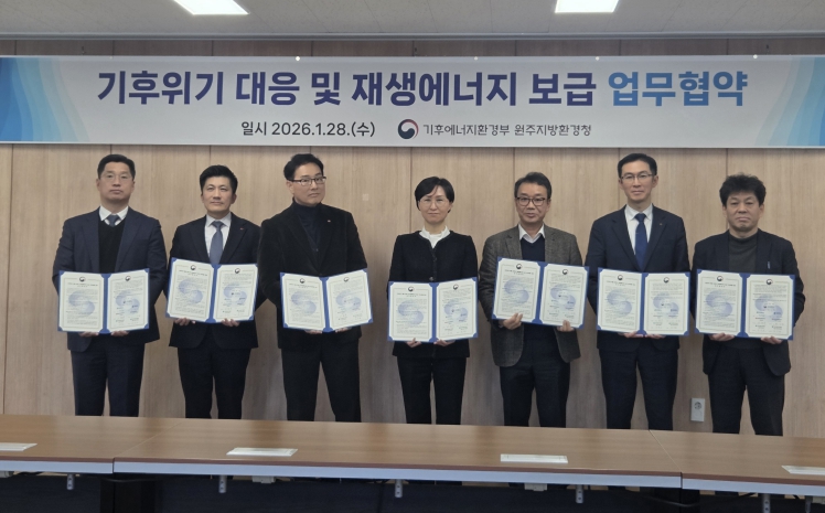 [뉴스노크=김인호 기자] 충북도는 28일 원주지방환경청, 강원특별자치도 및 에너지 공기관과 함께 기후위기 대응 역량을 강화하고 재생에너지의 안정적인 보급 확대를 위한 업무협약을 체결했다.