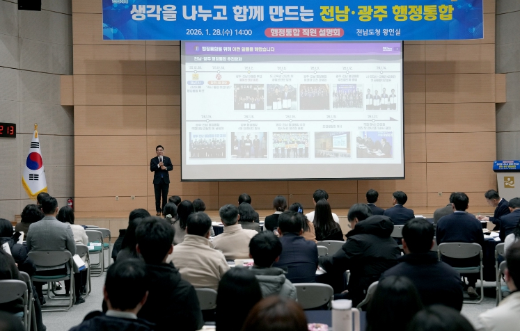 [뉴스노크=김인호 기자] 전라남도는 28일 도청 왕인실에서 직원들을 대상으로 ‘전남·광주 행정통합 직원설명회’를 열고, 추진 경과와 주요 쟁점을 공유하며 직원 의견을 청취했다.