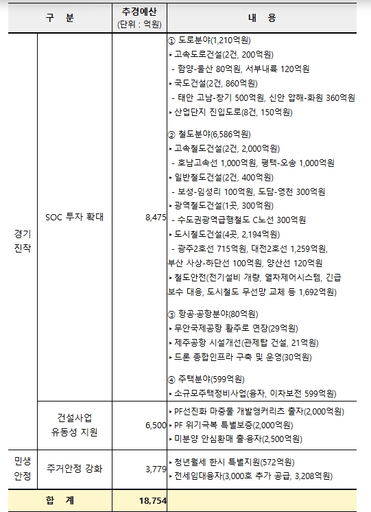 이번 추경예산에는 신규 건설투자 감소 및 유동성 부족으로 어려움을 겪고 있는 건설업계의 활력을 돋우고, 서민의 주거비를 경감하기 위해 필요한 국토부 소관 1조 8,754억원의 신규 세출예산이 반영됐다.