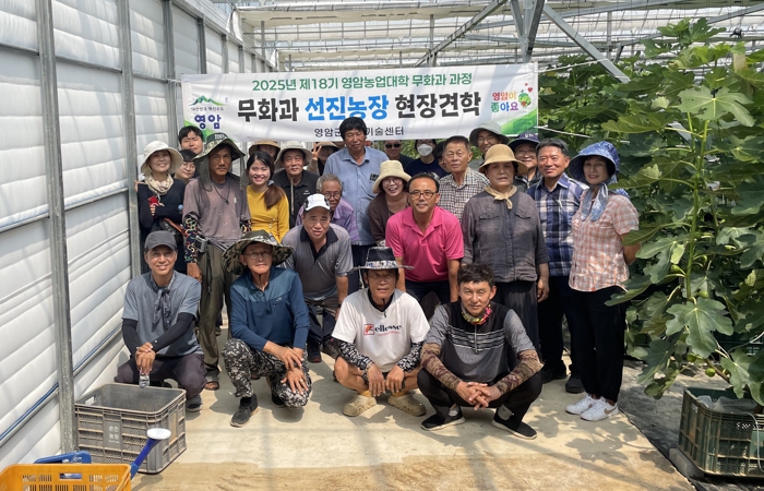 [뉴스노크=김인호 기자] 영암군이 10일 삼호읍 동역마을 무화과 재배 농가에서 영암농업대학 무화과 과정 교육생 30명이 참여하는 선진 무화과 재배지 현장 견학을 실시했다.