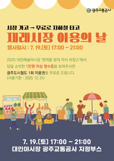 이번 행사는 ‘한 여름 밤의 미식 바캉스’를 주제로 한 ‘2025 대인예술야시장’과 연계해 진행되며, 공사는 19일 현장에서 일만 원 이상 구매한 영수증을 제시한 고객에게 2025년 12월 31일까지 사용 가능한 도시철도 1회 무료 이용권을 증정한다.
