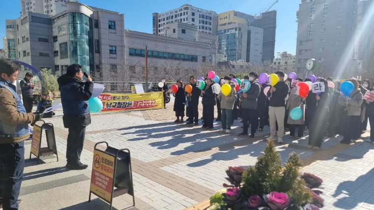 [뉴스노크=김인호 기자] 전국공무원노동조합 부산지역본부 남구지부는 오은택 남구청장의 유례없는 갑질 행정 및 인사 참사를 규탄하며, 2026년 1월 6일 12시, 중식시간을 이용하여 남구청 광장에서 남구 조합원 60여 명이 참여한 중식 선전전을 개최했습니다.