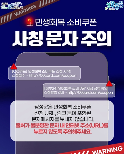 군 관계자는 “장성군은 민생회복 소비쿠폰에 관한 인터넷주소, 링크 등이 포함된 안내 문자 메시지를 절대 발송하지 않는다”면서 “쿠폰 안내를 빙자해 출처가 불분명한 인터넷주소(URL), 링크 등을 문자로 받았다면 즉시 지울 것”을 권장했다.