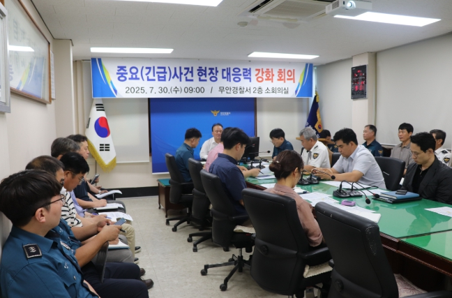 [뉴스노크=김인호 기자] 무안경찰서는 30일 2층 소회의실에서 경찰서장, 각 과장, 지·파출소장 등 40여 명이 참석한 가운데 중요 사건 현장대응력 강화 회의를 개최했다고 밝혔다.