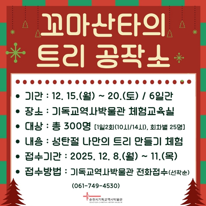 [뉴스노크=김인호 기자] 순천시는 다가오는 성탄절을 맞아 기독교역사박물관에서 어린이와 가족이 함께 참여하는 체험 프로그램 ‘꼬마산타의 트리 공작소’를 오는 15일부터 20일까지 운영한다고 밝혔다.