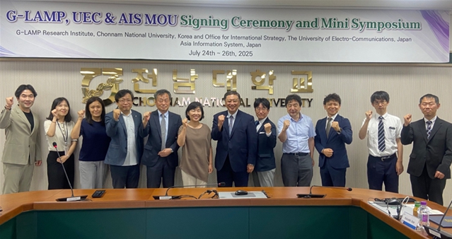 30일 전남대에 따르면 G-램프(LAMP)사업단(단장 정영희 교수)은 국제 연구 협력 체계 구축과 학술 교류 활성화를 위한 실질적 기반을 마련하기 위해, 지난 7월 24일부터 26일까지 3일간 대학본부 대회의실에서 일본 전기통신대학(UEC) 및 아시아정보시스템(AIS)과 업무협약(MOU)을 체결하고 국제 심포지엄을 공동 개최했다.