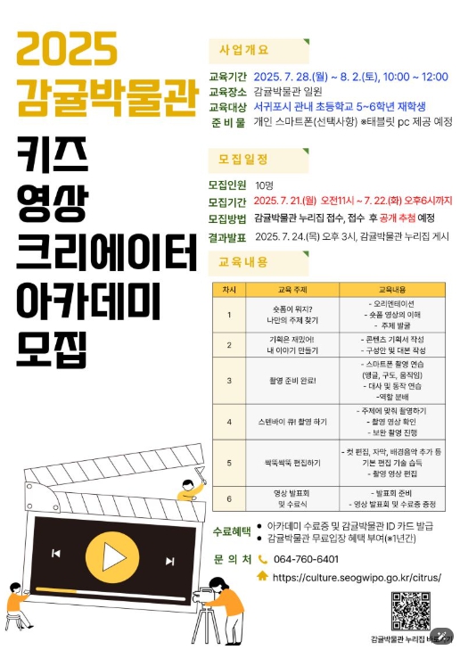 [뉴스노크=김인호 기자] 서귀포시 감귤박물관이 여름방학을 맞아 어린이를 위한 특별한 미디어 교육 프로그램인 '감귤박물관 키즈 영상 크리에이터 아카데미'를 운영할 예정이다.