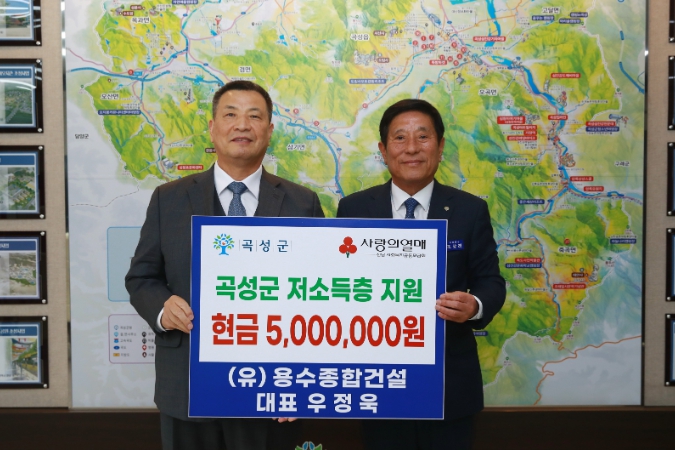조상래 곡성군수는“어려운 경기 상황에서도 지역사회 취약 어르신들에게 온정을 베풀어 주신 용수종합건설 우정욱 대표에게 깊은 감사의 뜻을 표하며, 기부금이 노인맞춤돌봄서비스 대상 어르신들에게 잘 활용될 수 있도록 하겠다”라고 전했다.