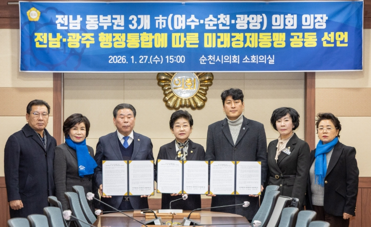 [뉴스노크=김인호 기자] 전라남도와 광주광역시의 행정구역 통합 추진이 급물살을 타고 있는 가운데, 여수시의회, 순천시의회, 광양시의회는 27일 전남·광주 행정통합에 대응하여 전남동부권의 공동발전과 위상 강화를 위한 미래경제동맹 공동선언문을 발표했다.