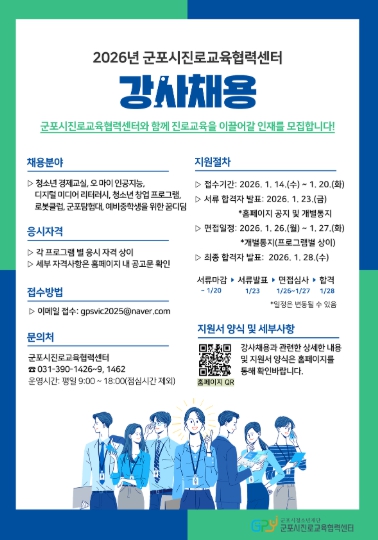 [뉴스노크=김인호 기자] (재)군포시청소년재단 군포시진로교육협력센터는 관내 청소년의 진로 탐색과 진로 역량 강화를 위해 '2026년 군포시진로교육협력센터 강사'를 채용한다고 밝혔다.