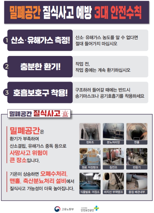 김영훈 노동부 장관은 “폭염 속 맨홀작업은 생명을 위협하는 치명적 위험 요소가 있는 만큼, 현장에서 질식재해 예방 3대 안전수칙을 철저히 지켜야 한다”라고 강조하면서 “고용노동부는 밀폐공간 질식사고 예방을 위해 지방자치단체와 함께 모든 역량과 수단을 총동원할 것”임을 밝혔다.